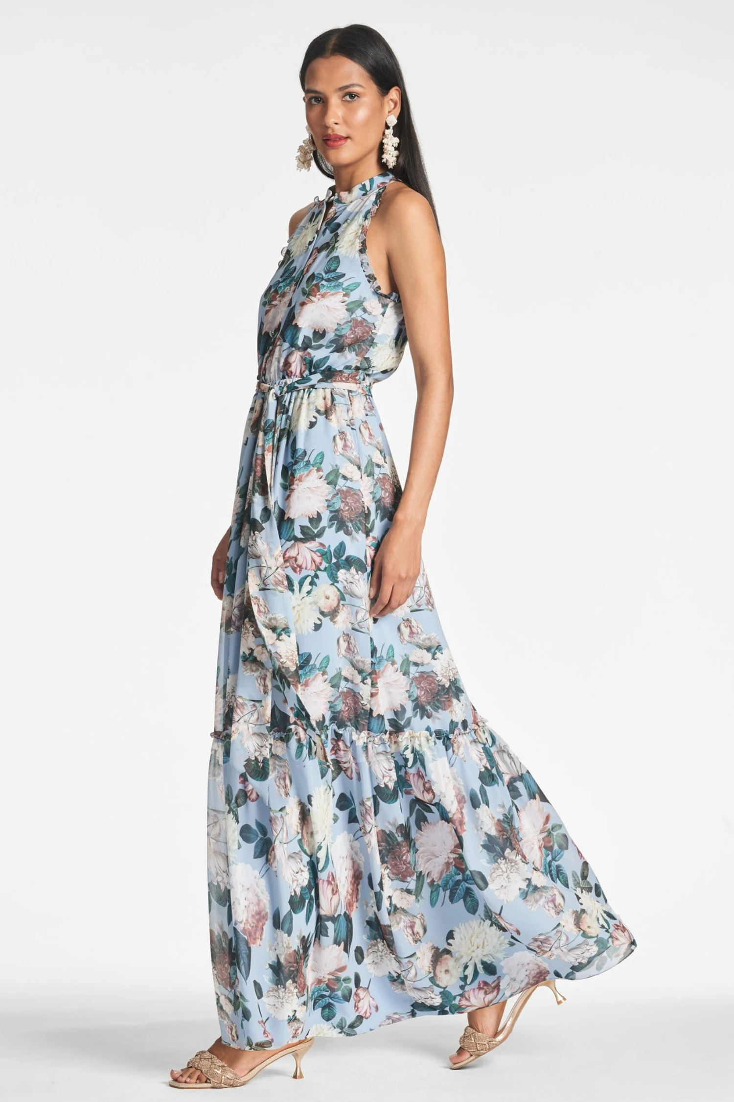 Blair is a perennial maxi silhouette. A shirt style bodice has functional buttons to the waist, a self-tie sash and lovely tiers to the hem.