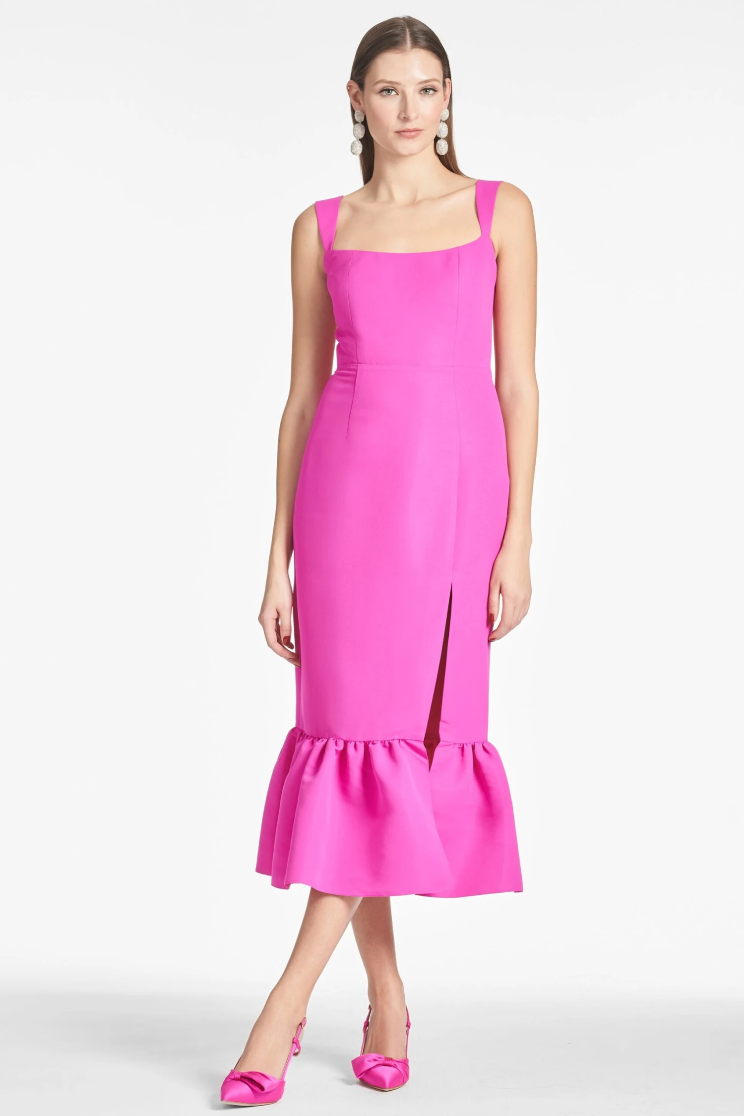 This is a shape that gives leading-lady, siren vibes. Sometimes the simplest things take the most time and engineering. This dress hugs and forgives in all the right places. Smocking at back allow for what feels and looks like a custom fit. Tapered straps top a trim sheath dress in cerise finished with an off-center slit.