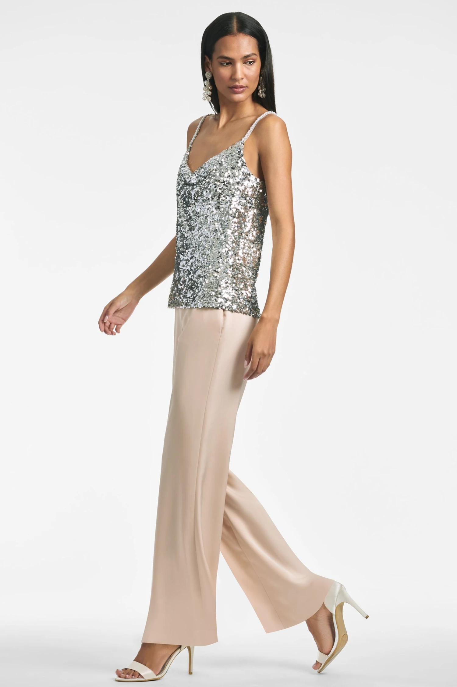 All tanks aren’t created equal… Leta is in our all-over stretch sequin has a cowl neckline and pearl straps making her the perfect pairing to our Talisa skirt. However, a top like this can’t be contained and will beg to be worn back to your favorite denim or chic charmeuse.