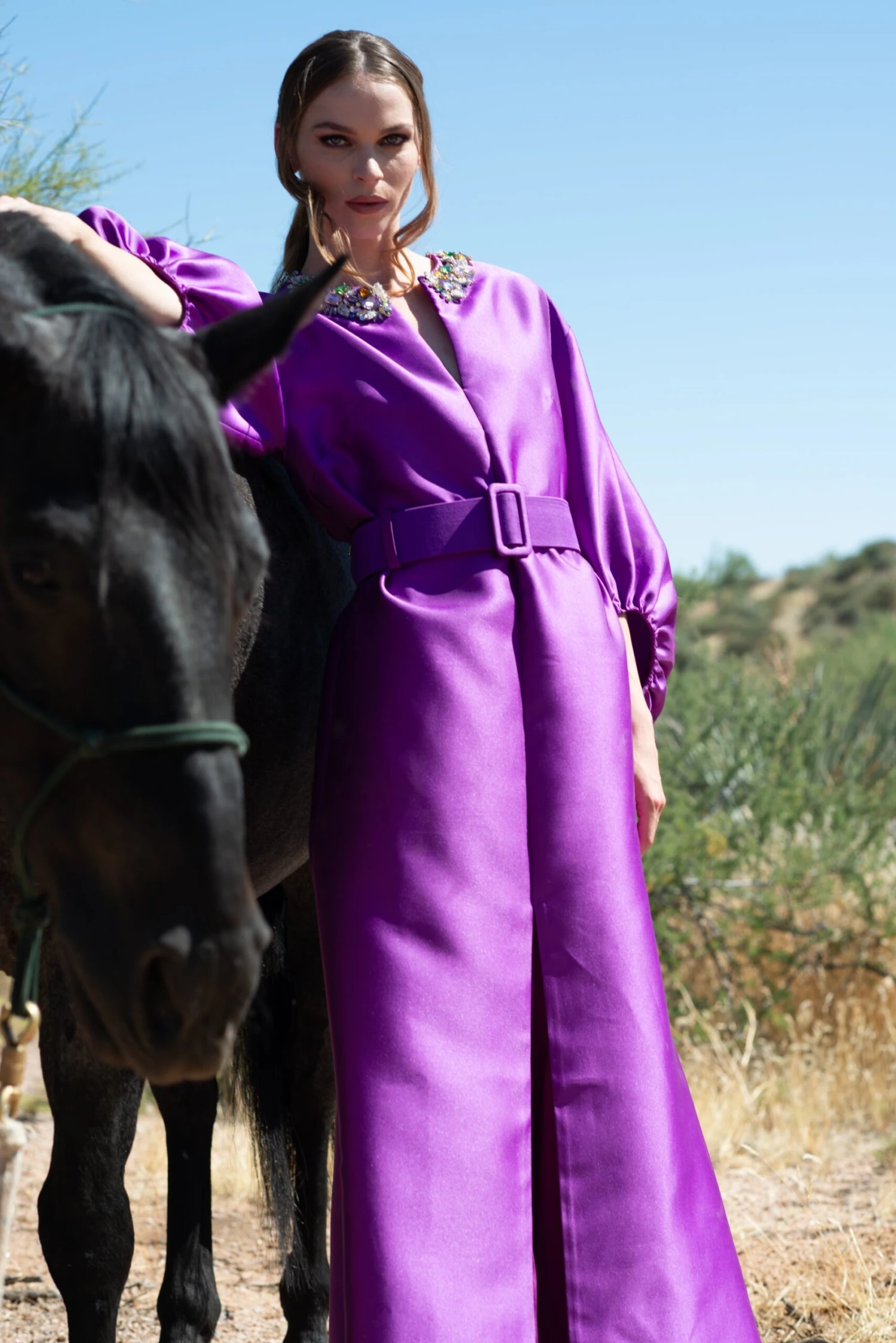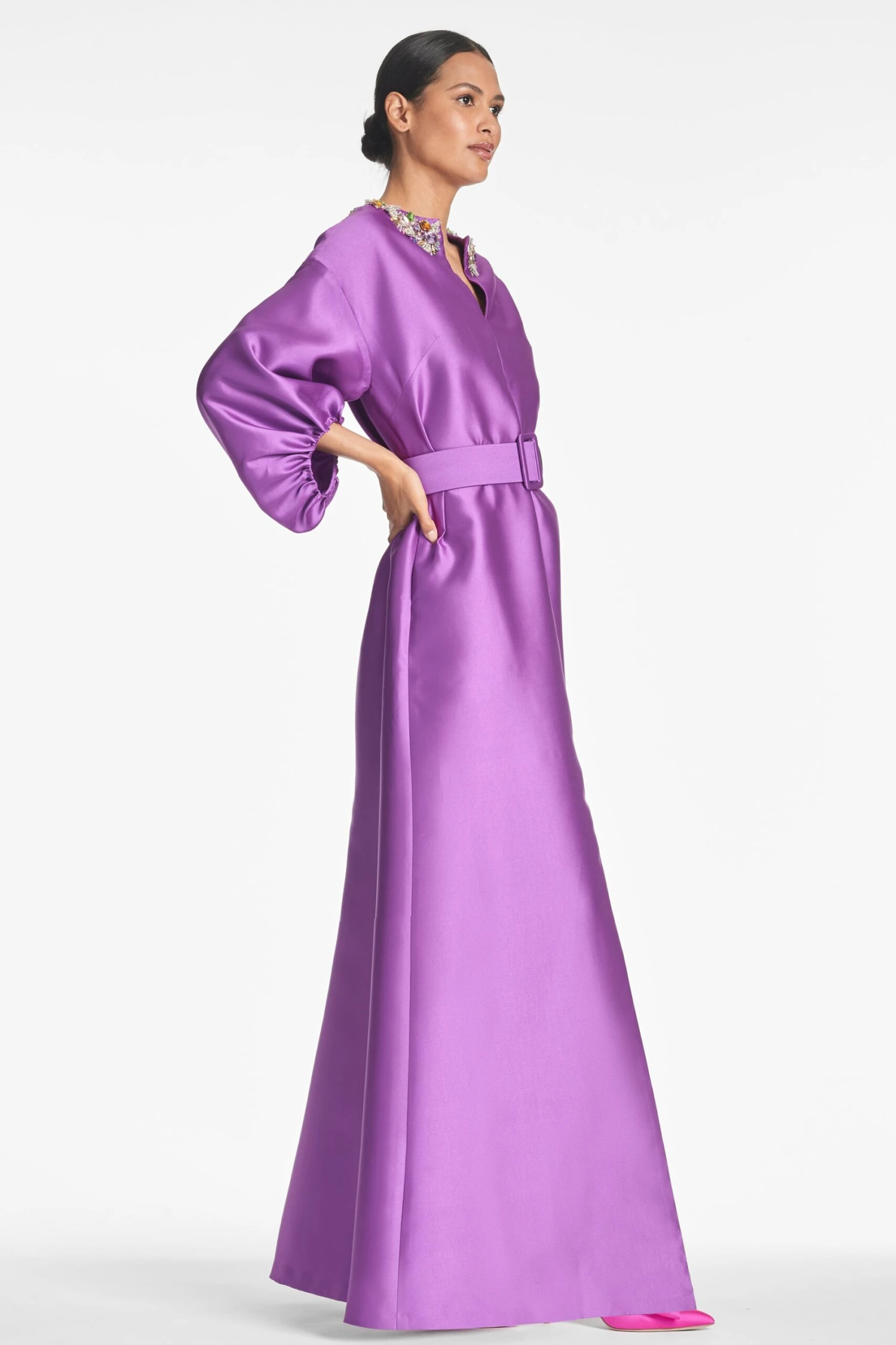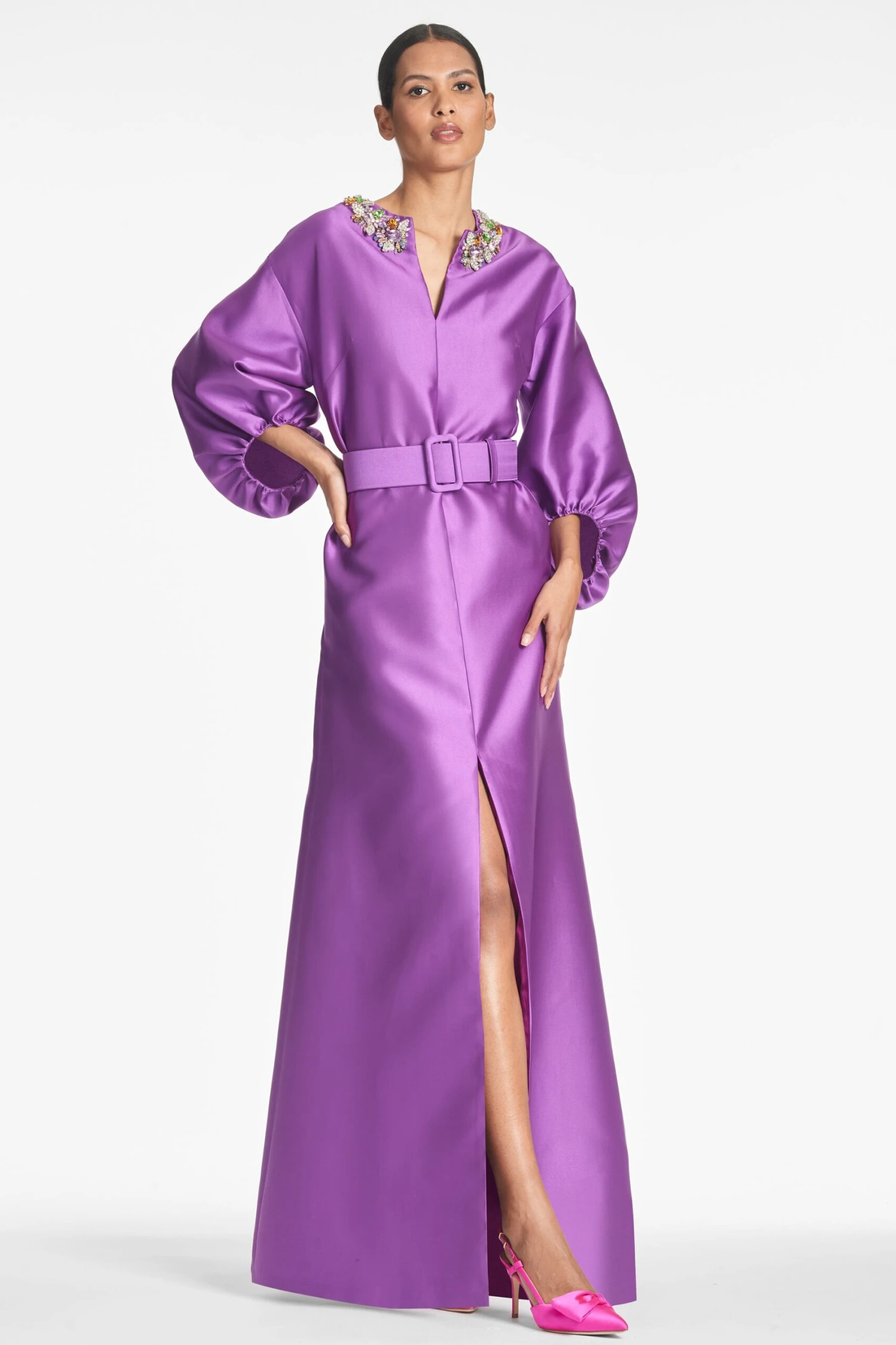 Simply put, the Olympia Gown is a showstopper. She’s made of luxurious single face Mikado in the most elegant long sleeve silhouette with a matching waist belt. The icing on the cake are the multicolor crystal embellishments at the collar. Prepare to wow in this one.